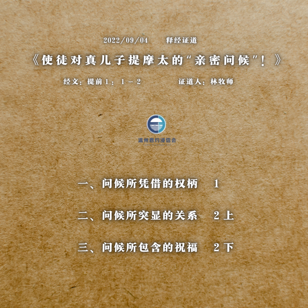 2022/09/04 主日证道 | 使徒对真儿子提摩太的“亲密问候” (提前1:1-2)
