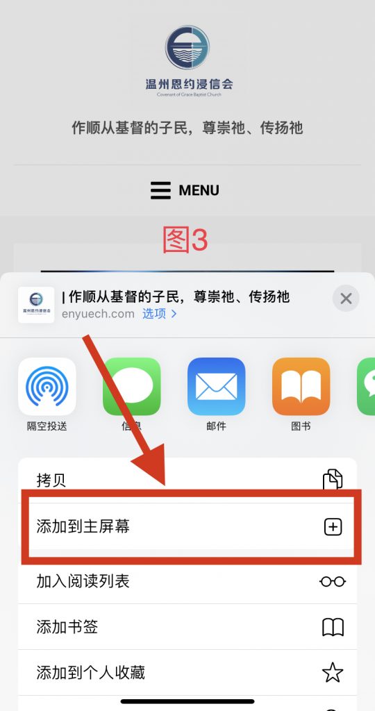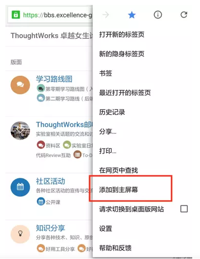 - 然后打开右上角的菜单,点击“添加到主屏幕”