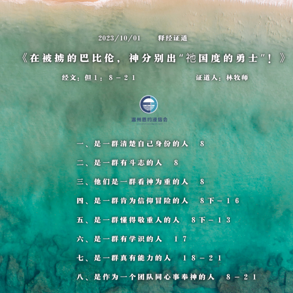 2023/10/01 证道录音 | 在被掳的巴比伦,神分别出“祂国度的勇士”! (但1:8-21)