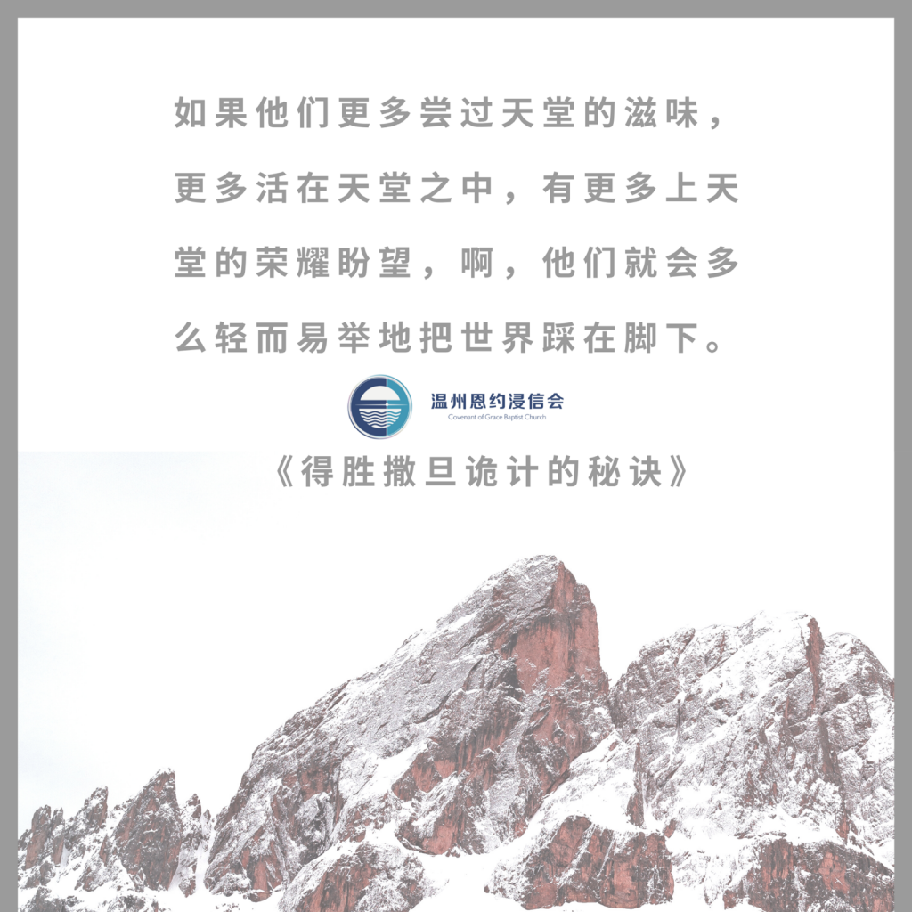 撒旦不愿我们全心投入服侍,总会在我们服侍时向我们发出很多负面的信息,向我们吐露服侍的艰辛和困难,以此想要劝我们放弃。但彼得前书3:13中说“你们若是热心行善,有谁害你们呢?”,提前6:6:“敬虔便是大利”。在服侍中所遇的艰难不能伤害我们,反而我们要得到更大的、只有在基督里才能得到且无人可以夺去的宝藏:“神的同在与眷顾、与神联合、罪得赦免、圣灵的喜乐、良心的平安”。就如作者所说“为什么一个蒙恩之人要因为苦难就离开圣洁之道呢?一个人的宝藏保管在陆地上一位朋友的手中,十分安全,这人为什么要惧怕海上的风暴,为之担忧呢?”注释中引用的路德的话也很鼓励人:“如果这工不好,我们为什么想要开始做它呢?如果它是好的,我们为什么要放弃它呢?……有得胜的基督在我们这一边,我们为什么要惧怕这被征服的世界呢?”