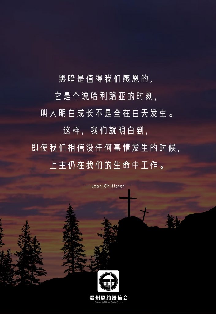 Joan Chittster 说:“黑暗是值得我们感恩的,它是个说哈利路亚的时刻,叫人明白成长不是全在白天发生。”